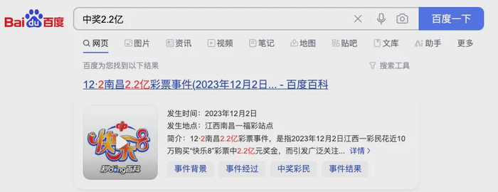 由于实在太过不可思议,该事件引发了长时间的热议,甚至在“百度百科”上还拥有了专属于自己的词条:“12·2南昌2.2亿彩票事件”——宛若某日本小学生侦探事件一般充满了悬疑感与神秘感: