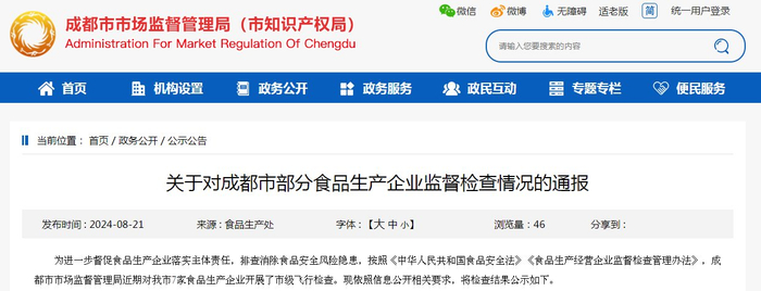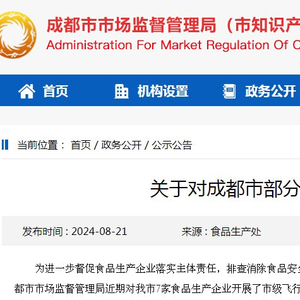 为进一步督促食品生产企业落实主体责任,排查消除食品安全风险隐患,按照《中华人民共和国食品安全法》《食品生产经营企业监督检查管理办法》,成都市市场监督管理局近期对我市7家食品生产企业开展了市级飞行检查。现依照信息公开相关要求,将检查结果公示如下。