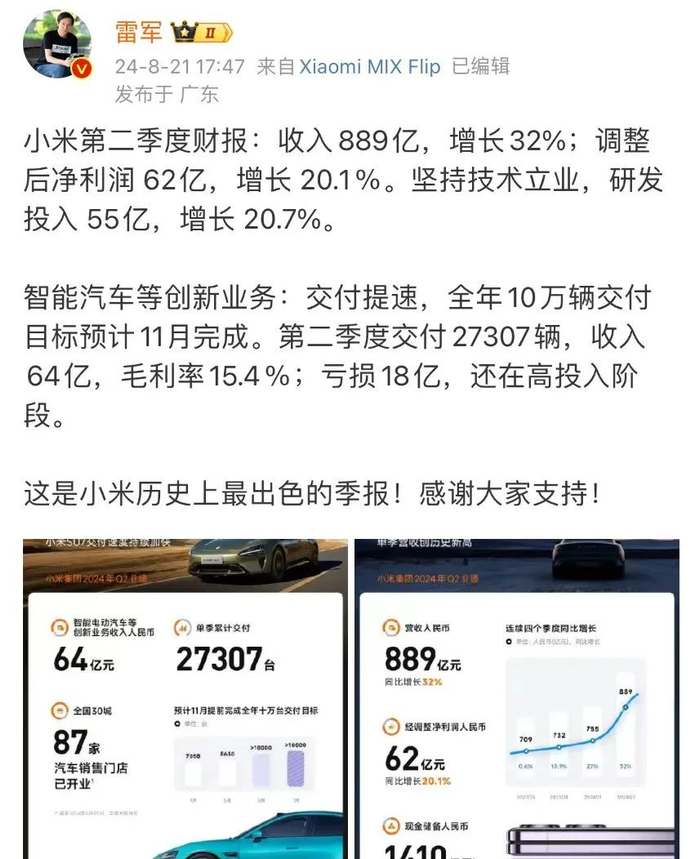 昨日,小米集团发布2024年Q2业绩报告。雷军发微博表示,这是小米历史上最出色的季报!