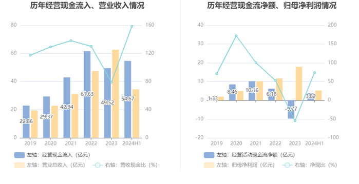 2024年上半年,公司营业收入现金比为158.56%,净现比为73.92%。