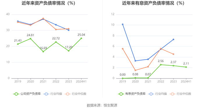 在偿债能力方面,公司2024年上半年末资产负债率为25.04%,相比上年末上升7.84个百分点;有息资产负债率为2.11%,相比上年末下降0.26个百分点。