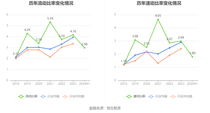 2024年上半年,公司流动比率为2.98,速动比率为1.80。