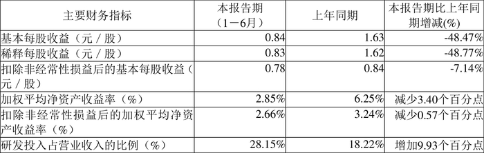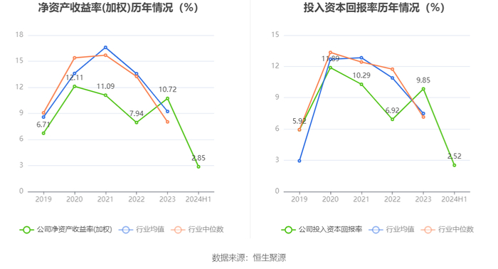 数据显示,2024年上半年公司加权平均净资产收益率为2.85%,较上年同期下降3.40个百分点;公司2024年上半年投入资本回报率为2.52%,较上年同期下降3.21个百分点。