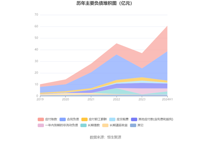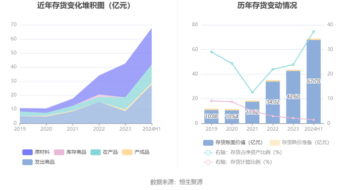 从存货变动来看,截至2024年上半年末,公司存货账面价值为67.78亿元,占净资产的37.29%,较上年末增加25.18亿元。其中,存货跌价准备为1.01亿元,计提比例为1.47%。