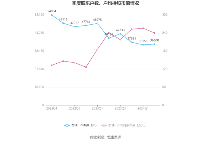筹码集中度方面,截至2024年上半年末,公司股东总户数为3.66万户,较一季度末增长了442户,增幅1.22%;户均持股市值由一季度末的255.71万元下降至239.80万元,降幅为6.22%。