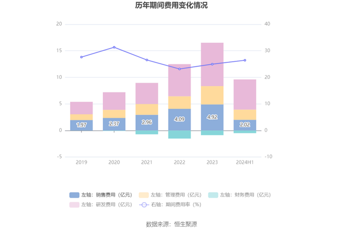 2024年上半年,公司期间费用为9.12亿元,较上年同期增加4.11亿元;期间费用率为26.45%,较上年同期上升6.61个百分点。其中,销售费用同比增长39.87%,管理费用同比增长58.56%,研发费用同比增长94.58%,财务费用由去年同期的-5567.17万元变为-4924.48万元。