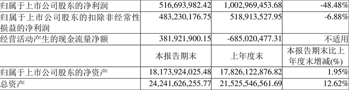 2024年上半年,公司经营活动现金流净额为3.82亿元,同比增加10.67亿元;筹资活动现金流净额-3.99亿元,同比减少5.97亿元;投资活动现金流净额18.39亿元,上年同期为16.53亿元。