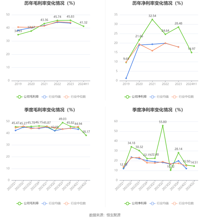 2024年上半年,公司毛利率为41.32%,同比下降2.60个百分点;净利率为14.97%,较上年同期下降24.70个百分点。从单季度指标来看,2024年第二季度公司毛利率为38.17%,同比下降3.91个百分点,环比下降6.77个百分点;净利率为14.51%,较上年同期下降41.29个百分点,较上一季度下降0.99个百分点。