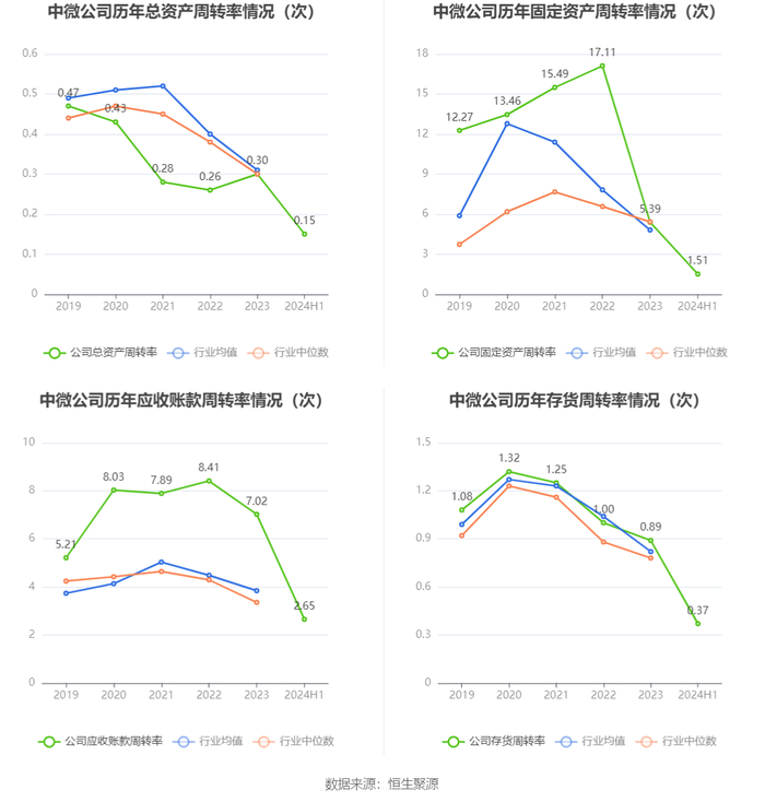 营运能力方面,2024年上半年,公司公司总资产周转率为0.15次,上年同期为0.12次(2023年上半年行业平均值为0.14次,公司位居同行业13/18);固定资产周转率为1.51次,上年同期为5.99次(2023年上半年行业平均值为2.74次,公司位居同行业4/18);公司应收账款周转率、存货周转率分别为2.65次、0.37次。