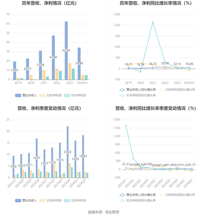 根据半年报,公司第二季度实现营业总收入18.43亿元,同比增长41.37%,环比增长14.81%;归母净利润2.68亿元,同比下降63.23%,环比增长7.39%;扣非净利润2.2亿元,同比下降24.32%,环比下降16.23%。
