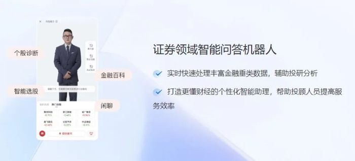 智能投顾数字人“九哥”——基于九章证券领域大模型,2023年8月九方智投推出了智能投顾数字人“九哥”。该数字人以九方智投业务人员为形象基础,依托大模型的金融知识库,能够为用户提供自然流畅的交互体验,涵盖客服问答、股票诊断、市场分析等多个方面。