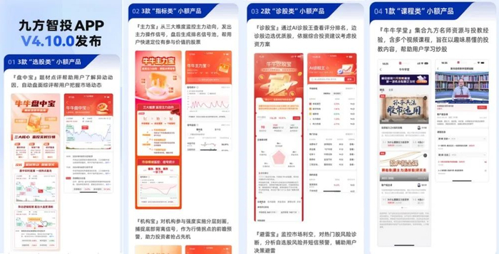 新一代股票投资助手九方智投APP——2024年1月,九方智投APP全面焕新完成迭代升级,8月已推出4.10.0版本。新版本的九方智投APP秉持优化产品、提升用户体验的初心,不仅拥有行情资讯、量化工具、短视频和直播、投资教育课程等功能,同时多次升级还对APP首页、九方智能数字人、全球指数、创作者中心、应用中心、聊天消息等板块进行全面优化,进一步提升九方智投APP的使用体验。