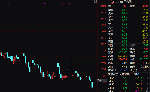 今日,三六零股价收跌3.69%。