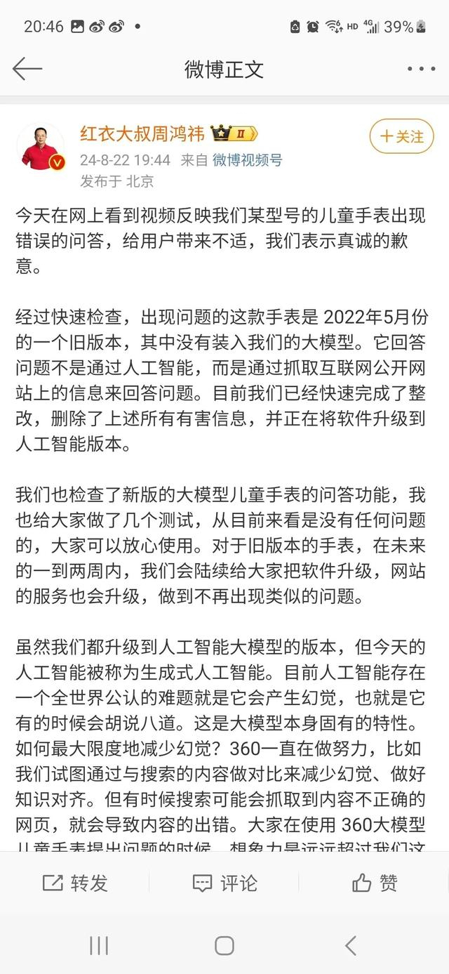 8月22日晚,360集团创始人、董事长周鸿祎在微博发文就360儿童手表答疑时出现争议言论道歉。周鸿祎表示,经过快速检查,出现问题的这款手表是2022年5月份的一个旧版本,其中没有装入公司的大模型。它回答问题不是通过人工智能,而是通过抓取互联网公开网站上的信息来回答问题。目前公司已经快速完成了整改,删除了上述所有有害信息,并正在将软件升级到人工智能版本。