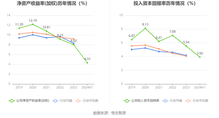 数据显示,2024年上半年公司加权平均净资产收益率为4.33%,较上年同期下降0.02个百分点;公司2024年上半年投入资本回报率为3.92%,较上年同期增长0.79个百分点。