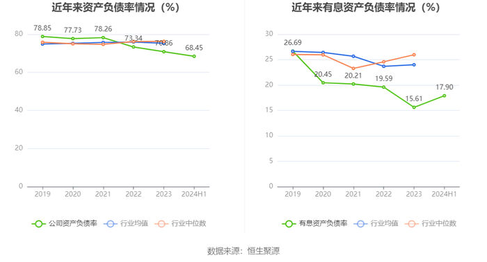 在偿债能力方面,公司2024年上半年末资产负债率为68.45%,相比上年末下降2.41个百分点;有息资产负债率为17.90%,相比上年末上升2.29个百分点。