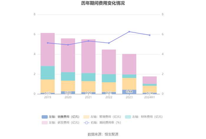 2024年上半年,公司期间费用为1.78亿元,较上年同期减少1042.97万元;期间费用率为5.93%,较上年同期下降0.22个百分点。其中,销售费用同比下降21.16%,管理费用同比增长33.8%,研发费用同比下降17.36%,财务费用同比下降31.28%。