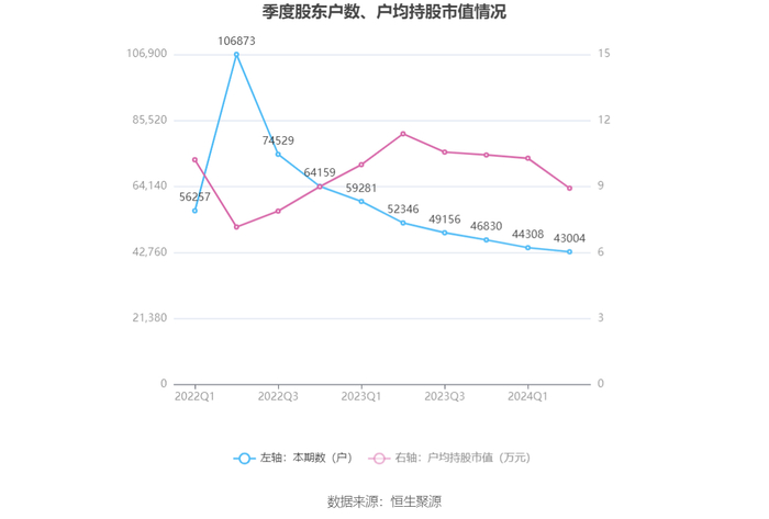 筹码集中度方面,截至2024年上半年末,公司股东总户数为4.3万户,较一季度末下降了1304户,降幅2.94%;户均持股市值由一季度末的10.28万元下降至8.92万元,降幅为13.23%。