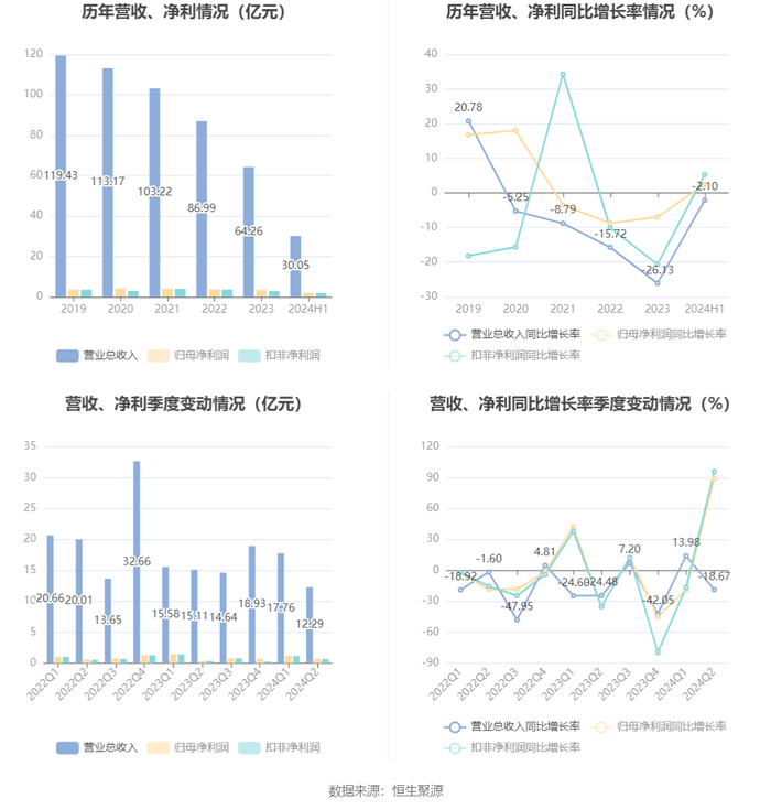 根据半年报,公司第二季度实现营业总收入12.29亿元,同比下降18.68%,环比下降30.77%;归母净利润6856.1万元,同比增长88.90%,环比下降42.20%;扣非净利润6758.18万元,同比增长95.80%,环比下降42.85%。