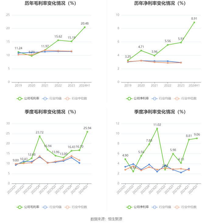 2024年上半年,公司毛利率为20.48%,同比上升5.01个百分点;净利率为8.91%,较上年同期上升1.94个百分点。从单季度指标来看,2024年第二季度公司毛利率为25.94%,同比上升11.98个百分点,环比上升9.24个百分点;净利率为9.06%,较上年同期上升6.26个百分点,较上一季度上升0.25个百分点。