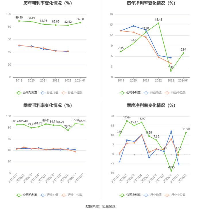 2024年上半年,公司毛利率为86.68%,同比上升1.16个百分点;净利率为6.94%,较上年同期下降1.38个百分点。从单季度指标来看,2024年第二季度公司毛利率为85.98%,同比上升1.27个百分点,环比下降1.60个百分点;净利率为11.50%,较上年同期上升4.11个百分点,较上一季度上升10.40个百分点。