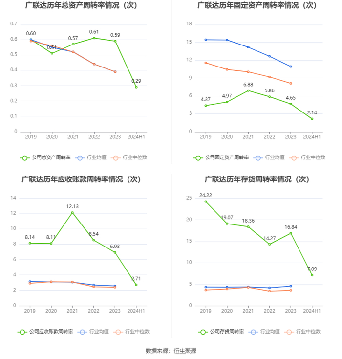 营运能力方面,2024年上半年,公司公司总资产周转率为0.29次,上年同期为0.28次(2023年上半年行业平均值为0.17次,公司位居同行业22/103);固定资产周转率为2.14次,上年同期为2.14次(2023年上半年行业平均值为5.13次,公司位居同行业71/103);公司应收账款周转率、存货周转率分别为2.71次、7.09次。