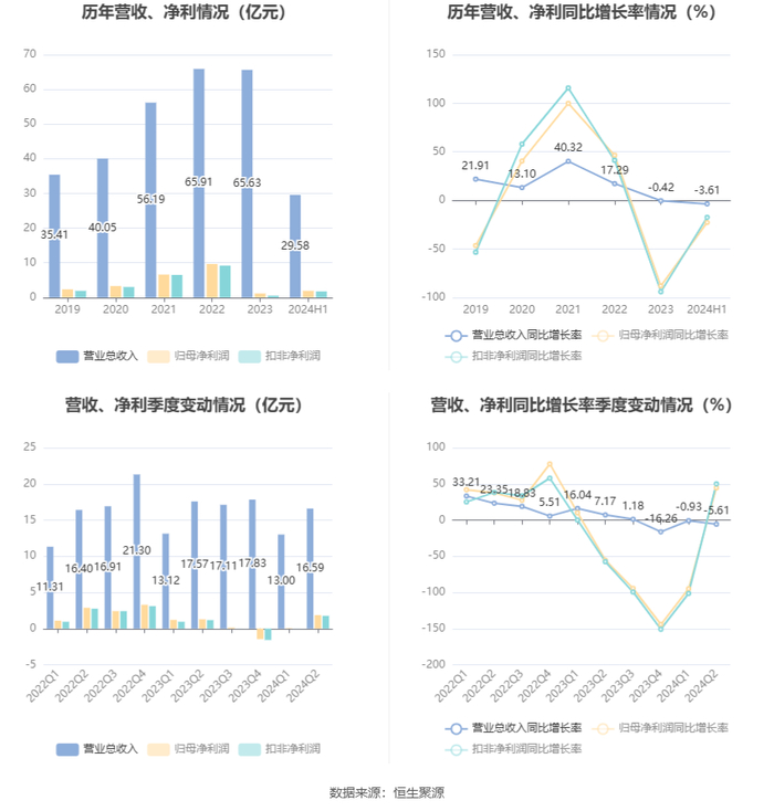 根据半年报,公司第二季度实现营业总收入16.59亿元,同比下降5.61%,环比增长27.60%;归母净利润1.86亿元,同比增长44.66%,环比增长2955.89%;扣非净利润1.76亿元,同比增长50.12%,环比增长12753.56%。