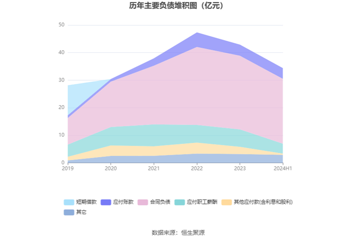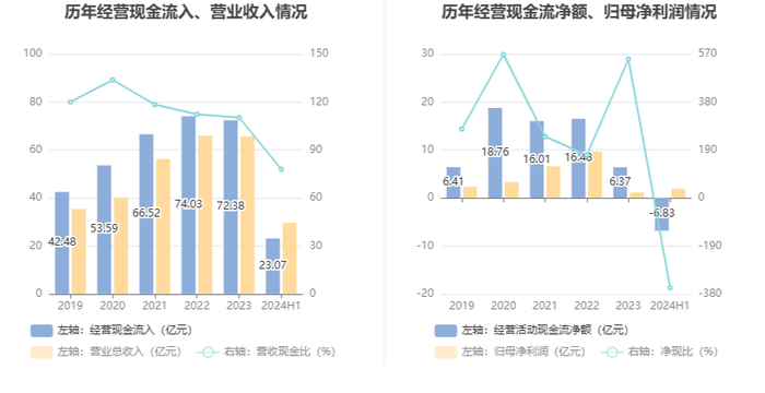 2024年上半年,公司经营活动现金流净额为-6.83亿元,同比增加2743.21万元;筹资活动现金流净额-3.93亿元,同比增加8672.24万元;投资活动现金流净额-2.26亿元,上年同期为-6.14亿元。