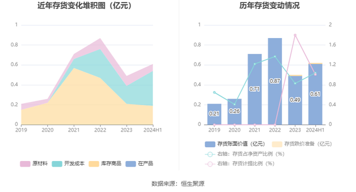 从存货变动来看,截至2024年上半年末,公司存货账面价值为6140.52万元,占净资产的1.04%,较上年末增加1250.08万元。其中,存货跌价准备为62.57万元,计提比例为1.01%。