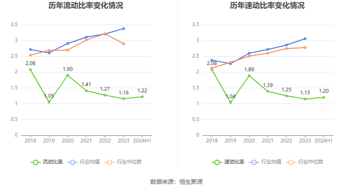 2024年上半年,公司流动比率为1.22,速动比率为1.20。