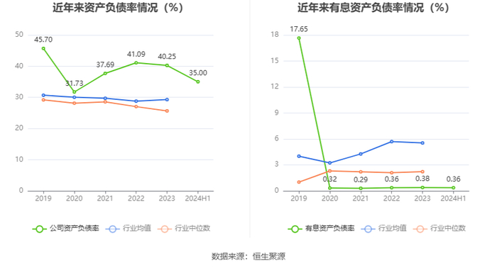 在偿债能力方面,公司2024年上半年末资产负债率为35.00%,相比上年末下降5.25个百分点;有息资产负债率为0.36%,相比上年末下降0.02个百分点。