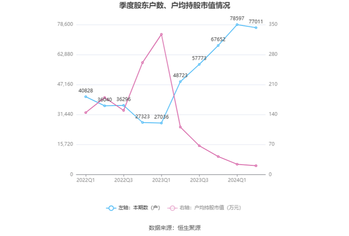 筹码集中度方面,截至2024年上半年末,公司股东总户数为7.7万户,较一季度末下降了1586户,降幅2.02%;户均持股市值由一季度末的24.15万元下降至20.71万元,降幅为14.24%。