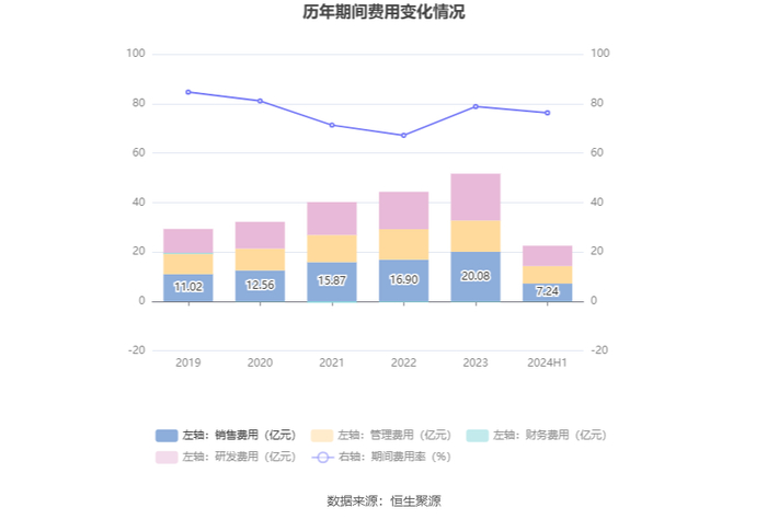 2024年上半年,公司期间费用为22.40亿元,较上年同期减少7498.39万元;但期间费用率为76.26%,较上年同期上升0.36个百分点。其中,销售费用同比下降14.23%,管理费用同比增长12.34%,研发费用同比下降4.6%,财务费用由去年同期的-1710.43万元变为-990.34万元。