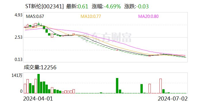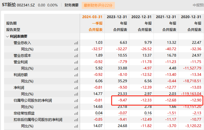 今年4月,因连续三年净利润亏损,且2023年度审计报告显示公司持续经营能力存在不确定性,新纶新材股票被深交所实施“其他风险警示”并停牌1天,股票简称变为“ST新纶”,股票交易的日涨跌幅限制为5%。