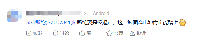 由于ST新纶曾进军新能源产业,亦有“果链”企业的名号,在资本市场上曾引发不少投资者关注。对于ST新纶的摘牌,不少资深股民在社交平台上表示惋惜,称“就像一场梦”。也有投资者表示,“新纶要是没退市,这一波固态电池肯定能蹭上”。