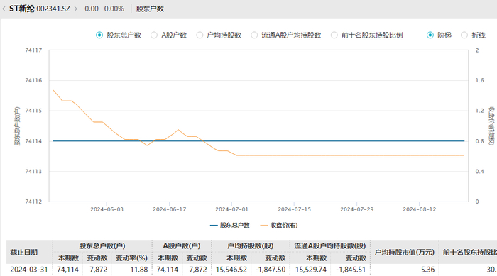 数据显示,截至2024年3月31日,ST新纶A股股东户数为7.41万户,户均持股市值为5.36万元。
