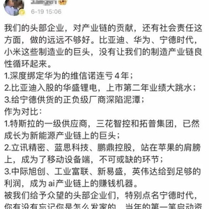 前不久,网上有一个贴子引发了大家的关注。该贴子称中国的头部企业,对产业链的贡献,还有社会责任这方面,做的远远不够好。比亚迪、华为、宁德时代,小米这些制造业的巨头,没有让我们的制造产业链良性循环起来。