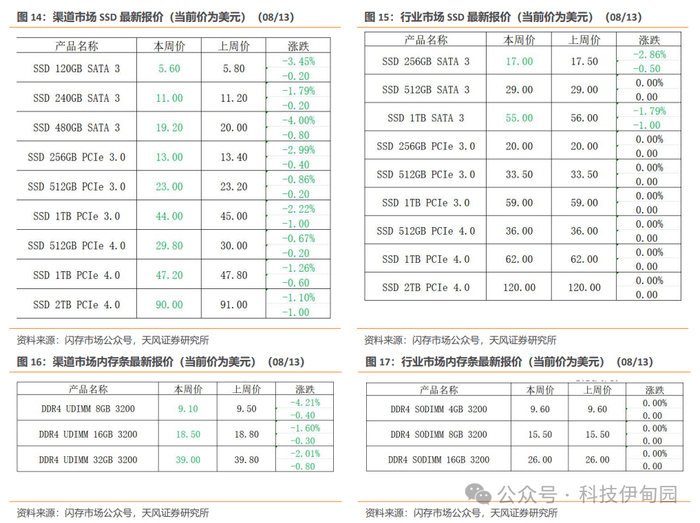渠道市场方面,近期,渠道市场成交量有所增加,但价格相对较低,且部分产品仍出现杀价行为;供应端目前基本无低价资源,渠道厂商也因成本高企备货意愿降低;另外询单量也逐渐增多,下游客户仍持“货比三家”态度。但整体来看此次开学季并未显著激发备货热潮,当前需求端的微弱增长能否反映出消费端复苏还为时尚早。本周渠道市场SSD和内存条报价继续下调,但与此前相比,降幅空间逐渐收敛。行业市场方面,近期存储厂商交易多以小单为主,且成交价格较为稳定,无大单成交;另外为加速库存周转,个别SATA SSD价格有所下调,PCIe系列SSD和内存条价格基本维持不变。