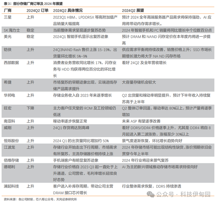 全年预期乐观,关注DDR3市场。就当前原厂的订单及未来预期看,当前存储市场需求呈现逐步复苏态势,AI、汽车维持快速增长,消费类需求改善明显,2024年全年发展预期维持乐观。从厂商发展重点看,随着行业供需关系大幅改善,存储原厂增加资本支出主要用于偏先进产品扩产。其中,SK海力士2024年微弱增加资本支出并主要用于高价值产品扩产,计划TSV产能翻倍,扩大256GB DDR5、16-24GB LPDDR5T等供应,并拓展移动模组如LPCAMM2和AI服务器模组如MCR DIMM等产品矩阵;三星继续增加HBM、1βnm DDR5、QLC SSD等的供应。
