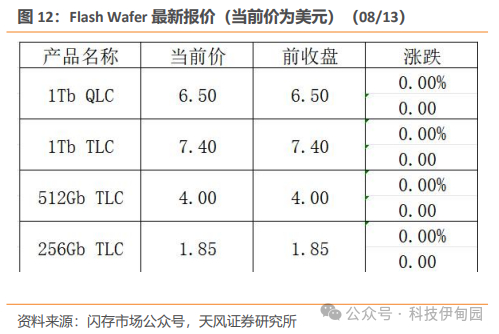 上游资源方面,本周NAND Flash Wafer价格不变,DDR颗粒价格小幅下调。其中,1Tb QLC Flash Wafer价格小幅下调0.1美元至6.50美元,其他持平不变;DDR4 16Gb 3200/16Gb eTT/8Gb 3200/8Gb eTT分别下调至2.99/2.67/1.34/1.14美元,DDR4 4Gb eTT价格不变。。