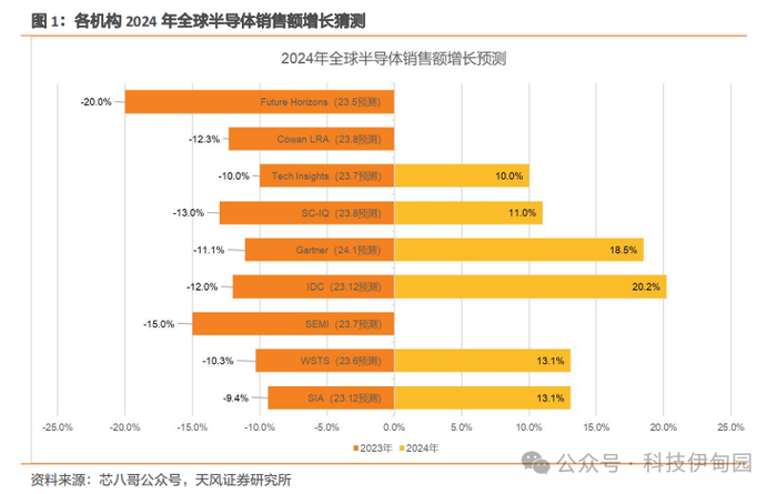从全球半导体销售额看,2023年半导体行业筑底已基本完成,从Q3厂商连续数月的稳定增长或奠定半导体行业触底回升的基础。全球部分主流机构/协会上修2024年全球半导体销售额预测,2024年芯片行业将出现10%-18.5%之间的两位数百分比增长。其中,IDC和Gartner最为乐观,分别预测增长达20.2%和18.5%。