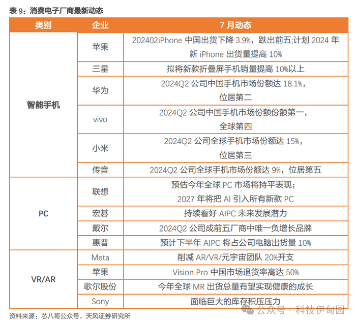 7月,全球智能手机和PC市场处于加速回暖阶段,苹果Vision Pro为代表的XR增长低于预期。