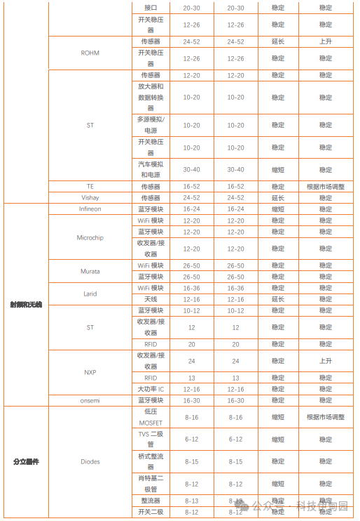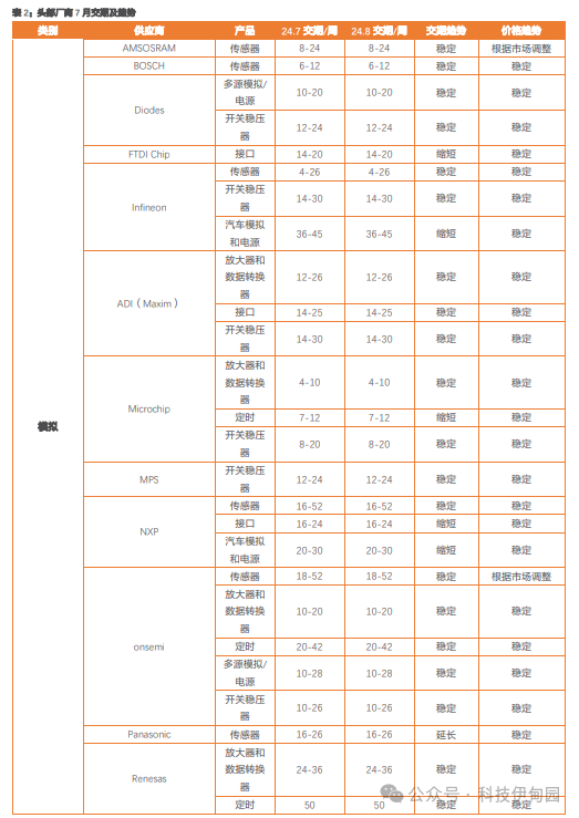 整体芯片交期趋势: 7月,主要芯片类别货期短期趋稳,但需要关注部分产品波动风险。