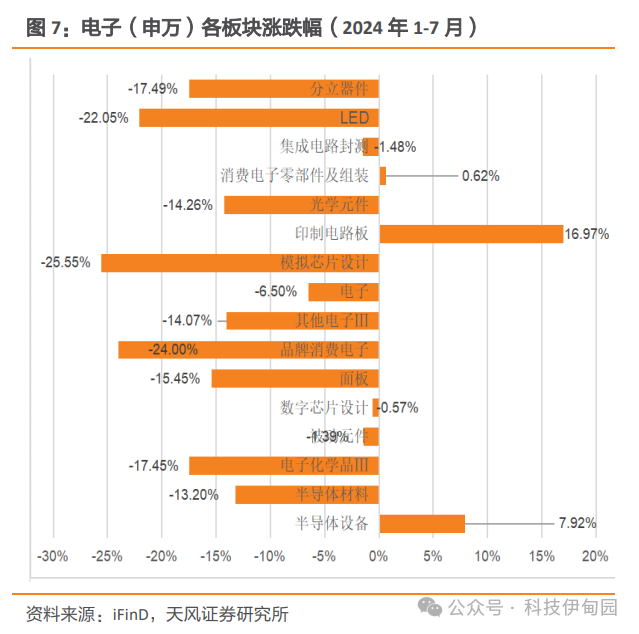 2024年1-7月,申万指数各电子细分板块大部分出现较大幅度下跌。涨幅最高(跌幅最小)的三名分别为印刷电路板(16.97%)、半导体设备(7.92%)和消费电子零部件及组装(0.62%)。跌幅居前三名分别为模拟芯片设计(-25.55%)、品牌消费电子(-24%)和LED(-22.05%)。
