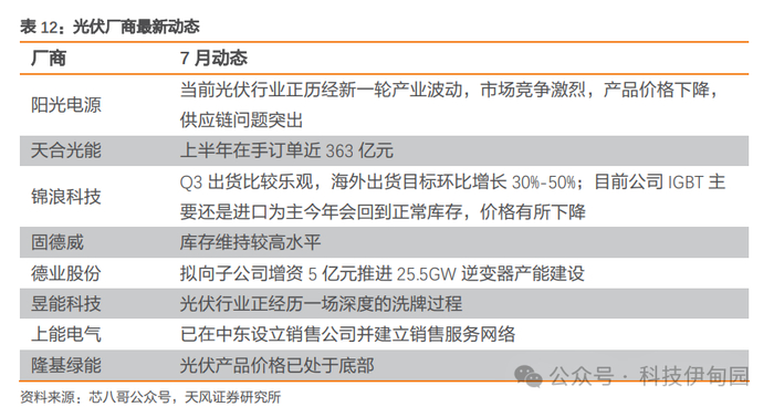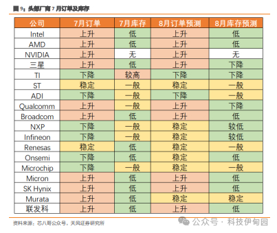 头部企业订单及库存情况:7月,消费类订单加速回升;汽车库存较高,订单波动;工业类订单不如预期,库存持续下降;通信订单疲软;新能源和AI订单需求强劲,关注光伏库存。