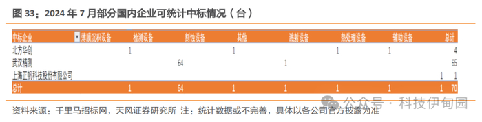 2024年7月,北方华创可统计中标设备4台,同比-42.86%,包括1台刻蚀设备,1台热处理设备,1台薄膜沉积设备,1台溅射设备。