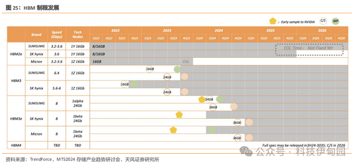 HBM的制程发展:目前市场上最新HBM3E,即第5代HBM,正搭载在英伟达的产品中。随着AI相关需求的增加,第六代高带宽存储器HBM4最早将于2026年开始量产。据韩媒报道,SK海力士已开始招聘 CPU 和 GPU 等逻辑半导体设计人员。SK海力士希望HBM4堆栈直接放置在GPU上,从而将存储器和逻辑半导体集成在同一芯片上。这不仅会改变逻辑和存储设备通常互连的方式,还会改变它们的制造方式。如果SK海力士成功,这可能会在很大程度上改变部分半导体代工的运作方式。