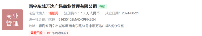 天眼查显示,8月21日,贵阳数博万达商业管理有限公司、贵阳龙湾万达商业管理有限公司、西宁东城万达广场商业管理有限公司、西昌万达商业运营管理有限公司成立,法定代表人均为潘韬男,注册资本均为100万人民币,经营范围均包含商业综合体管理服务、会议及展览服务、信息咨询服务等。