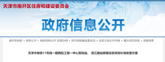 近日,南开区住房和建设委员会发布《地铁11号线一期西延工程一中心医院站、 澄江路站房屋征收项目补偿安置方案》,明确了房屋征收范围、补偿方案。