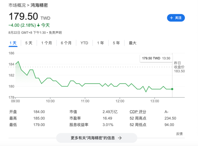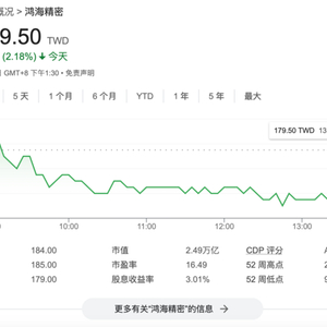 综上所述,高盛分析师预计富士康的12个月股价目标为257新台币,较当前有接近38%的上升空间。富士康在中国台湾股市周三下跌2.18%,报179.50新台币。